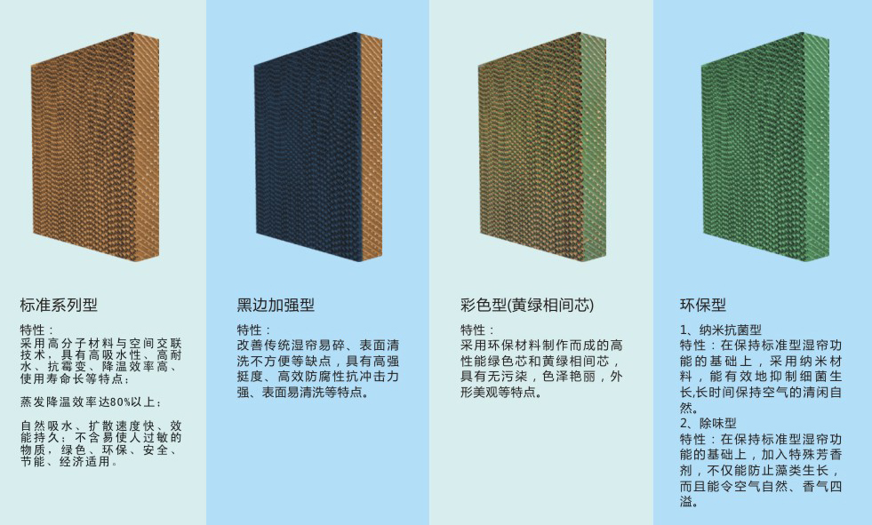 綠色濕簾型號:5060/5090/7060/7090 優(yōu)質(zhì)濕簾還不含易使皮膚過敏的苯酚等化學(xué)物質(zhì),安裝使用時對人體無毒無害,綠色、安全、節(jié)能、環(huán)保、經(jīng)濟。